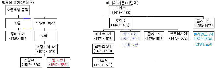 남편 헨리 2세의 모노그램을 목걸이와 드레스에 착용한 카트린 드 메디치 (1519-1589) 를 묘사한 미니어처에서 추출한 것이다 . 카트린 드 메디치 는 교황 클레멘스 7세의 손녀이다. 이런 경우를 재종손녀(再從孫女)라고 한다. 여기서 재종(再從)이라는 뜻은 서로 촌수를 따지면 6촌간계를 말한다. 교황은 성직자이니 공식적으로는 자식이 있을 수 없으며 사촌형제들의 자식인 5촌 조카들이 낳은 자녀이기 때문에 손녀가 된다. 그러므로 촌수를 따져보면 6촌지간이다. 카트린은 교황 클레멘스7세의 사촌형인 '피에르 드 메디치' (1471~1503)의 손녀가 된다. 클레멘스 7세의 큰아버지의 큰 아들이 낳은 자식의 딸이다. 즉 카트린의 아버지는 로렌초 2세 드 메디치이다.