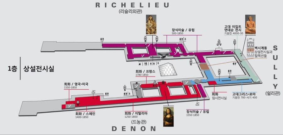 루부르 박물관의 전시실에는 역사적으로 유명한 실무진(재상)의 이름이 붙어 있다. 앙리4세때의 재무장관 쉴리공작, 루이13세때의 리슐리외추기경, 그리고 나폴레옹시대 때의 초대 루브르 박물관 관장이었던 드농남작이 그들이다.