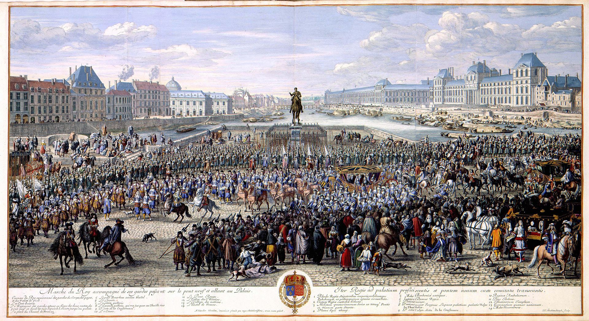 March of the King accompanied by his guards passing over the Pont Neuf in the direction of the Palace French: Marche du Roy accompagné des ses gardes passant sur le Pont Neuf et allant au Palais