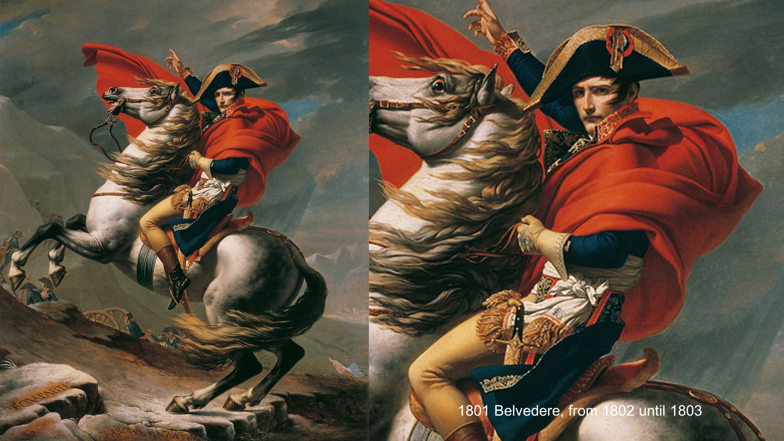 Bonaparte has an orange cloak, the crispin (cuff) of his gauntlet is embroidered, the horse is piebald, black and white, and the tack is complete and includes a standing martingale. The girth around the horse's belly is a dark, faded red. The officer holding a sabre in the background is obscured by the horse's tail. Napoleon's face appears youthful.